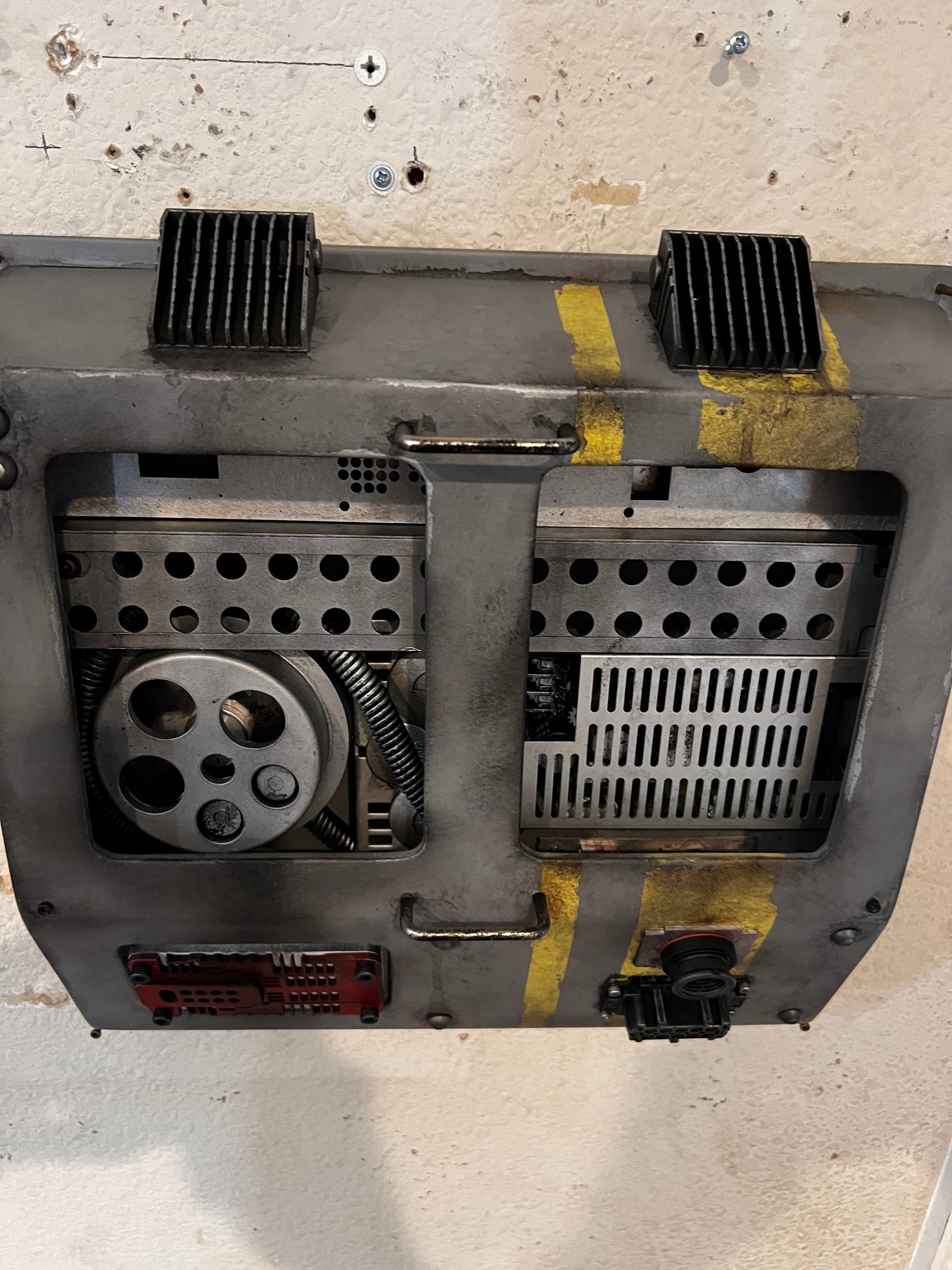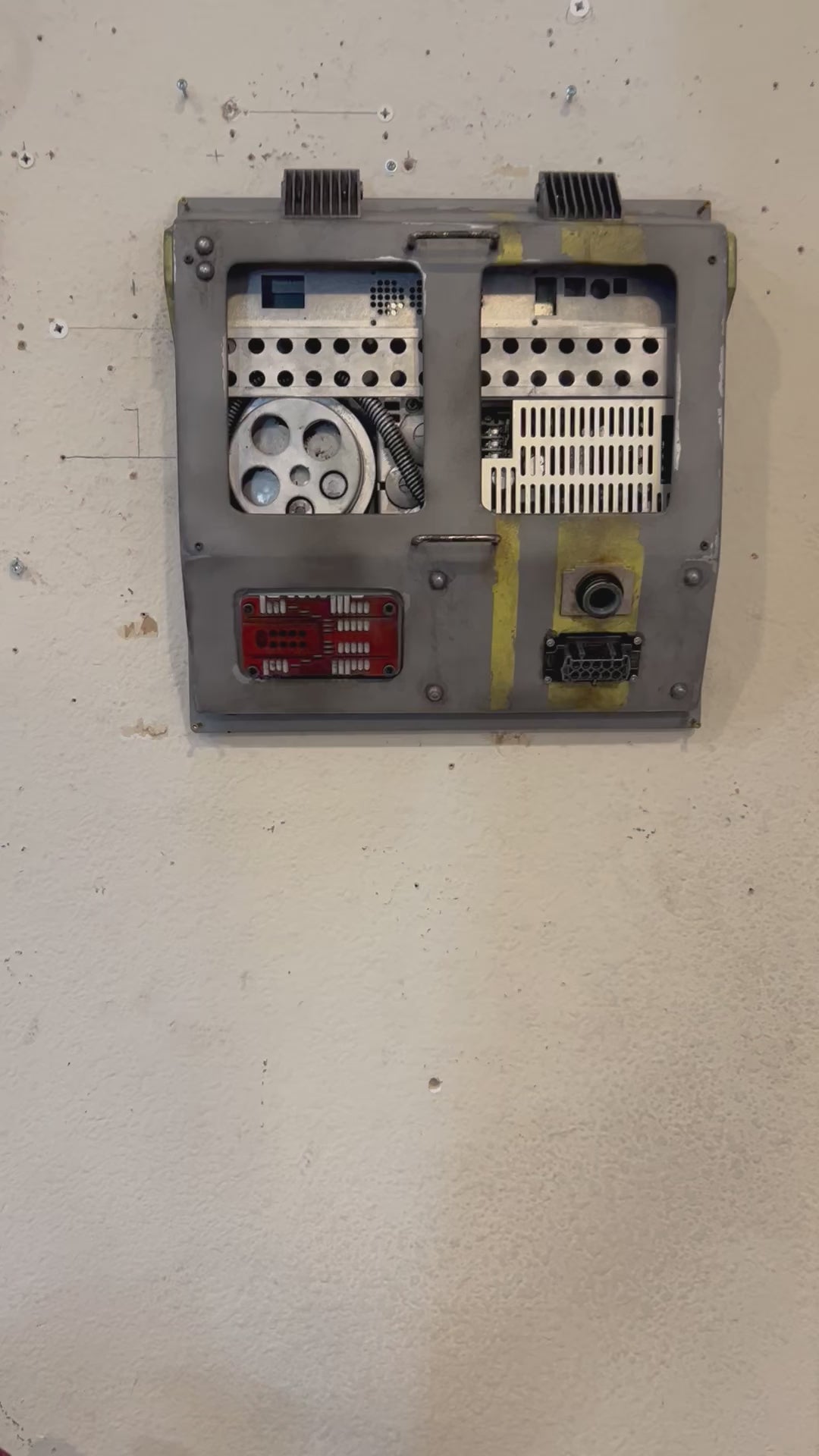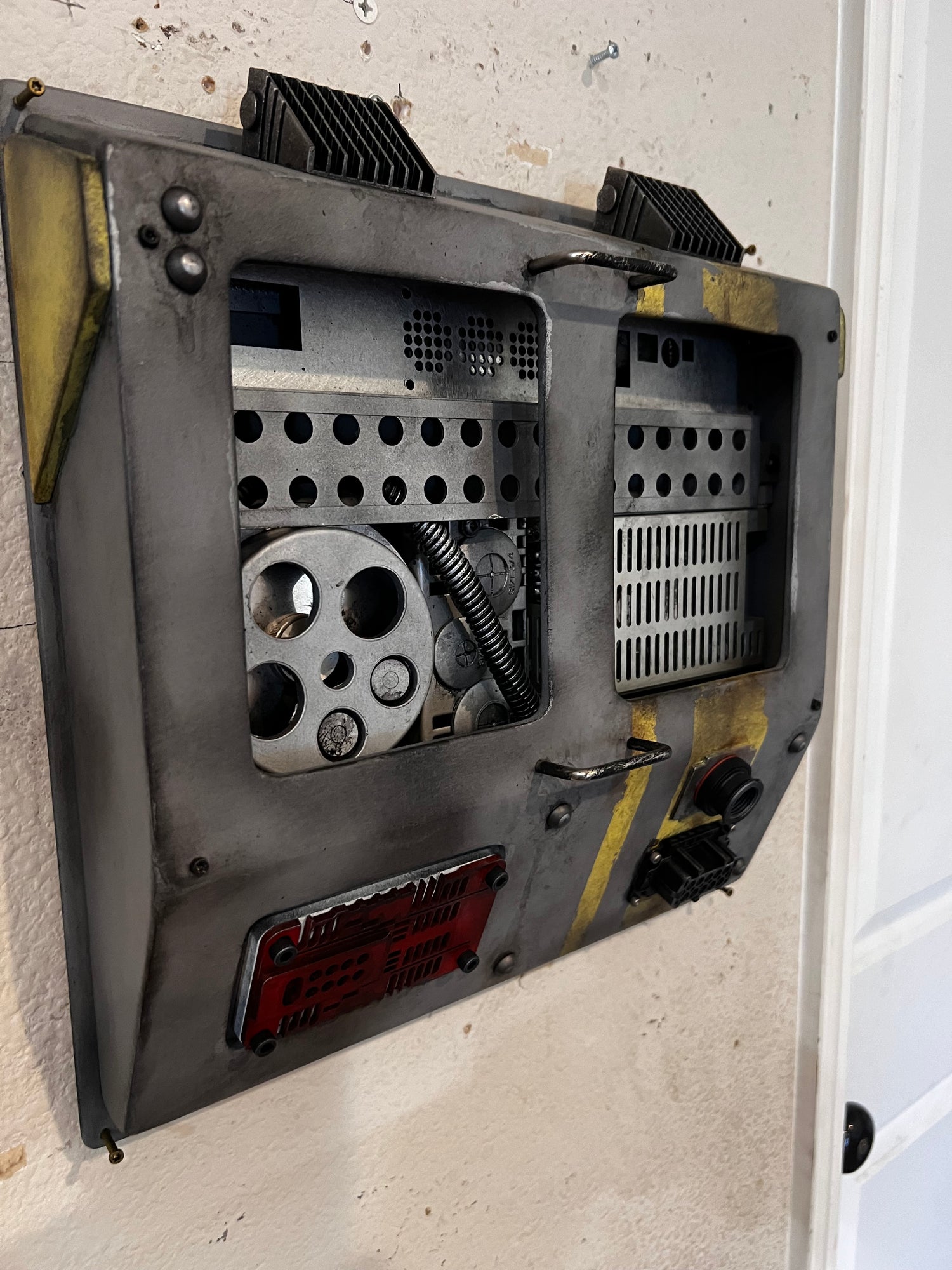Have made from mdf wood, electronics inside box are mostly metal - this panel does not light up or have sound . 14”x14”